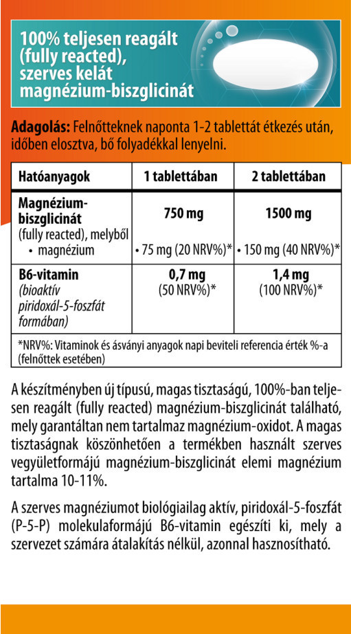 A szerves magnéziumot biológiailag aktív, piridoxál-5-foszfát (P-5-P) molekulaformájú B6-vitamin egészíti ki, mely a szervezet számára átalakítás nélkül, azonnal hasznosítható.