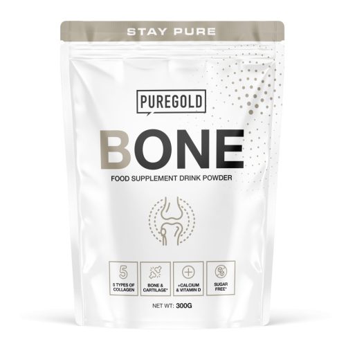 Pure Gold Bone Powder ízesített hidrolizált marha és tengeri halkollagén étrend-kiegészítő italpor hozzáadott vitaminokkal, ásványi anyagokkal, hidrolizált csirkeporc porral, tojáshéjhártya-hidrolizátummal, és édesítőszerekkel.
