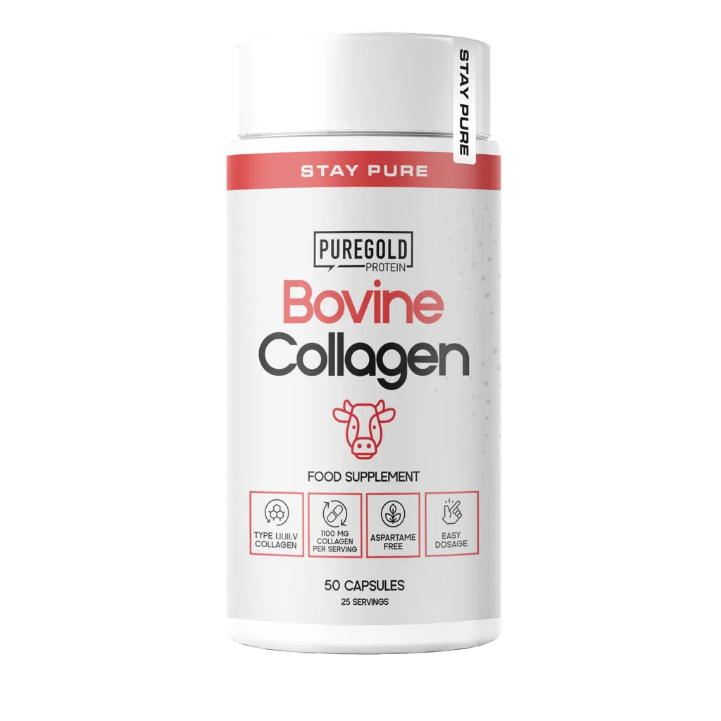 A PureGold Bovine Collagen marhakollagén kapszula adagonként 1100 mg prémium minőségű, I, II, III és V típusú hidrolizált kollagént biztosít a bőr, ízületek és kötőszövetek támogatására. Könnyen adagolható, aszpartám-mentes étrend-kiegészítő, amely ideális választás a napi kollagénpótláshoz.