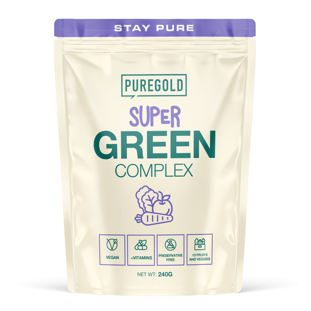 A PureGold Super Green Complex egy ízesítetlen italpor 13 féle gyümölcs- és zöldségporral, magas vastartalommal, valamint hozzáadott A- és C-vitaminnal, spirulinával a fáradtság és kimerültség csökkentésére. Vegán, zsírmentes, tartósítószer- és aszpartám-mentes összetétele támogatja az immunrendszert és a kiegyensúlyozott étrendet.