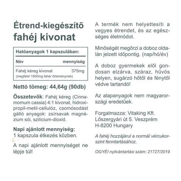 Kétféle fahéj létezik. Az egyik a jóízű, finom illatú, Ceylonból származó, ami a sütemények és a capuccino kitűnő kiegészítője. Élettani hatása nem jelentős. Ezzel szemben a másik típusa a kínai, cassia fahéj ,  melynek   számos jótékony hatását igazolták. A Vitaking kapszula az utóbbi, cassia növényt tartalmazza. Kapszulánként 375mg fahéj kivonat, ami megfelel 1500 mg fahéj őrleménynek.