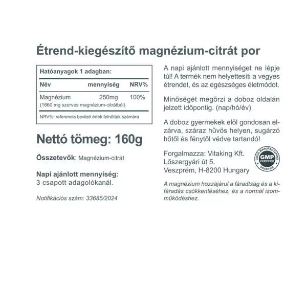 A magnézium egy létfontosságú ásványi anyag a szervezet számára. Hozzájárul a fáradtság csök?kentéséhez, az idegrendszer megfelelő működéséhez, a normál izomműködéshez, és részt vesz a normál energiatermelő anyagcsere-folyamatokban. A Vitaking legújabb magnézium készítménye 160 g magnézium port tartalmaz. Napi ajánlott mennyigésége (2 adagolókanál) megfelel 250mg elemi magnéziumnak.