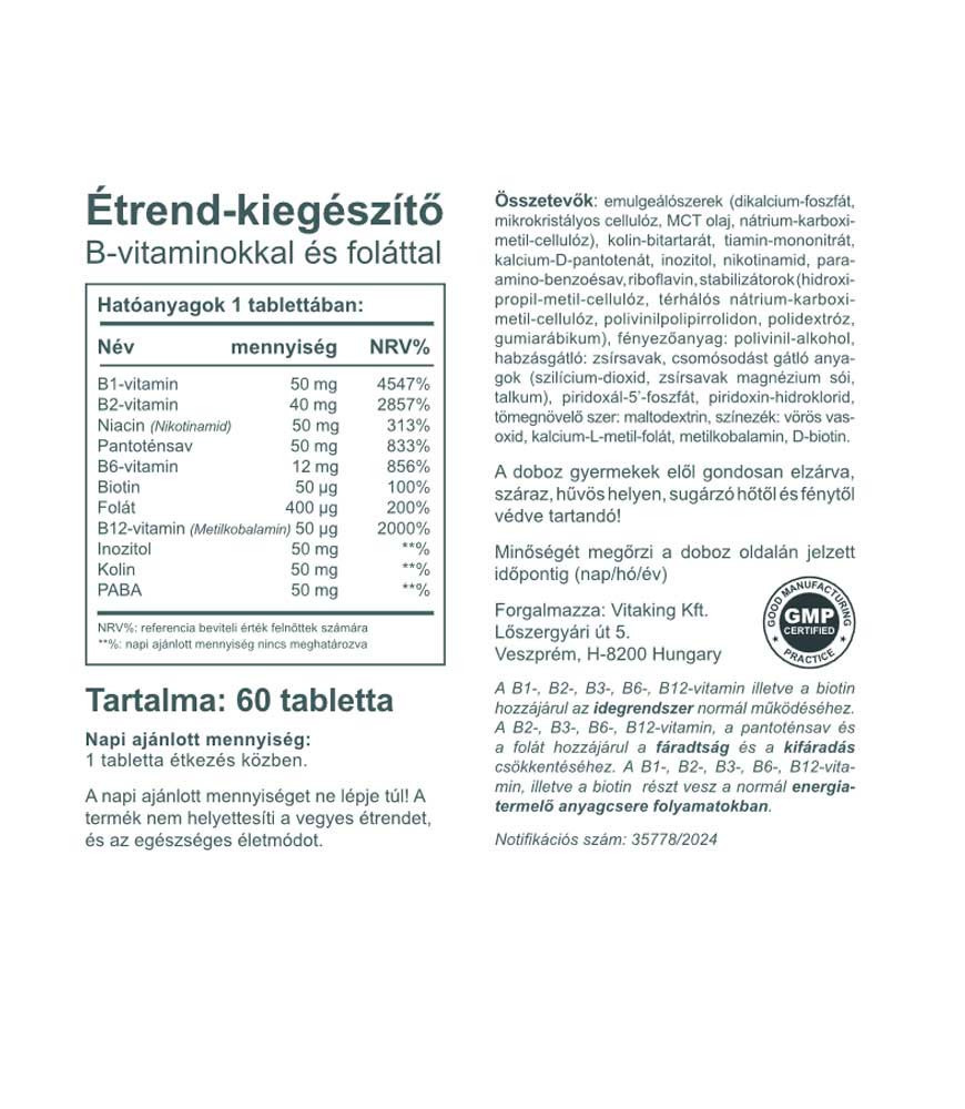 A Mega B-50 egy remek, valóban nagy potenciájú étrend-kiegészítő, ami tartalmazza az összes B vitamint, ami szükséges a szervezetének. A B-vitamin valójában nem egyetlen vitamint takar, hanem egy egész vitamin családot (B1, B2, B3, B6, folsav, B12, biotin és pantoténsav). Így tehát, mivel a különböző B-vitaminok szorosan kötődnek egymáshoz, célszerű őket együtt fogyasztani. A megújult Vitaking Mega-50 a folsavat folát formában tartalmazza, ami folsav természetben előforduló formája.