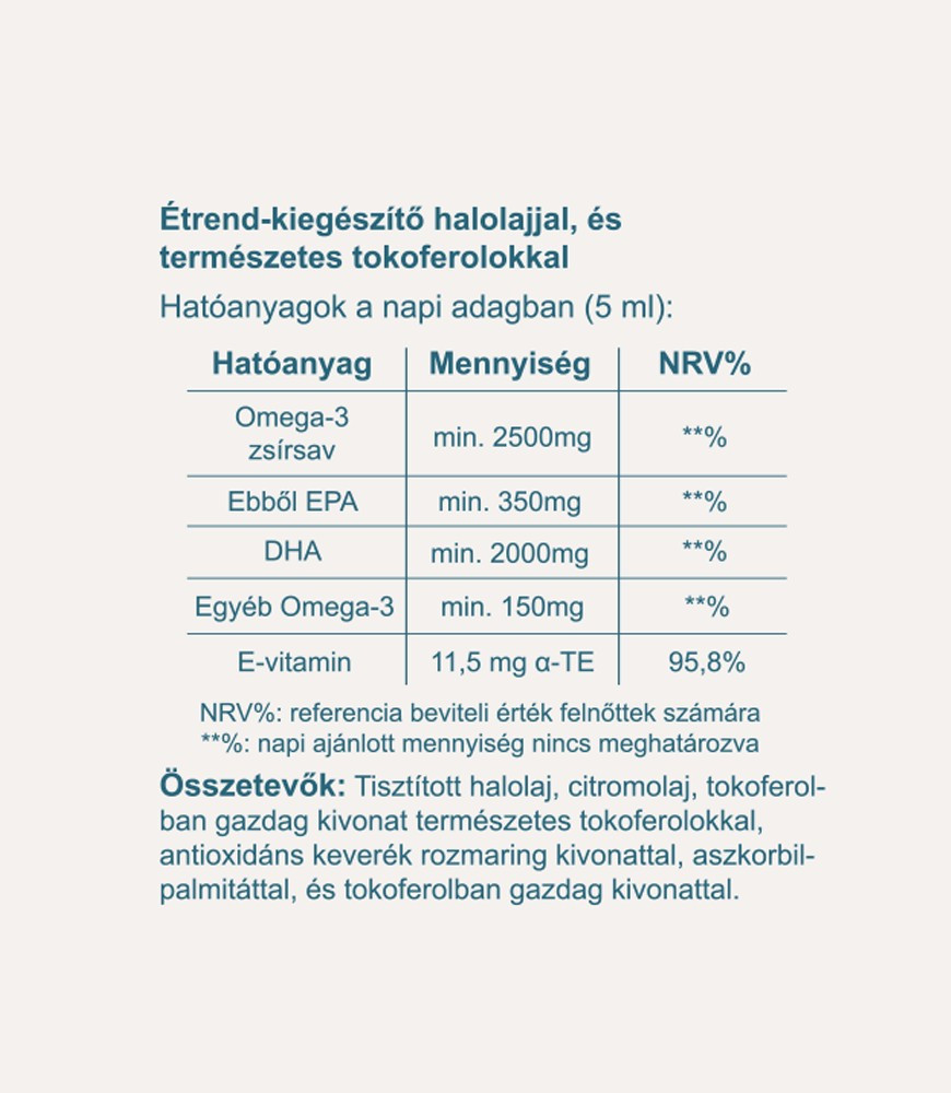 Napi ajánlott mennyiség: 5 ml omega-3 olaj étkezés közben vagy közvetlenül étkezés után. Adagoláshoz használja a mellékelt adagoló poharat. Fogyasztható higítatlanul vagy egy pohár vízben feloldva.
